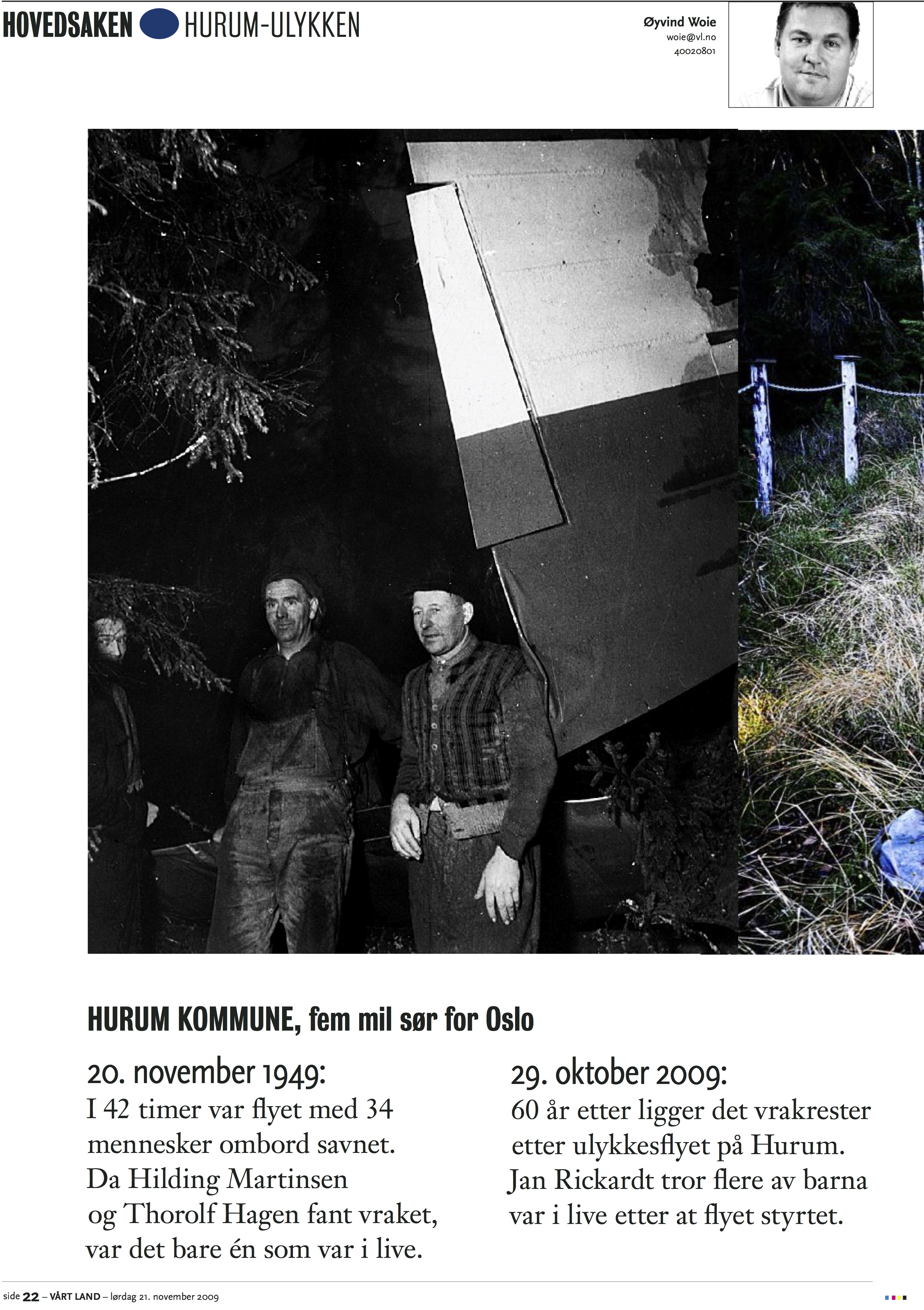 Faksimile fra Vårt Land 20. november 2009. Bildene viser de to redningsmennen til venstre og vrakstedet slik det ser ut i dag til høyre.